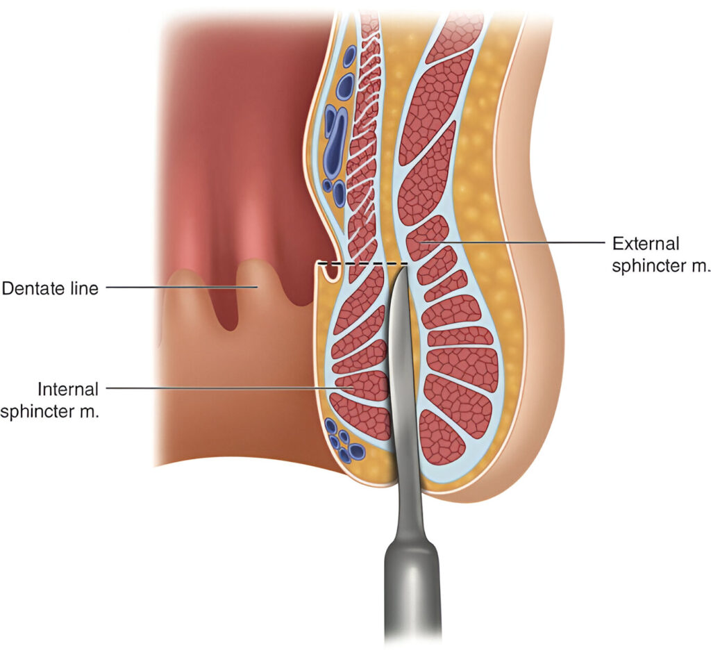During this procedure, your doctor will create a small side incision into your internal anal sphincter. (Side means from the side.)You have two anal sphincter muscles that encircle your anal canal and regulate your bowel movements. The inner ring is the internal sphincter, and the outer one encircles it. The outer one is voluntary, but the inner one is involuntary. This one remains contracted as a default, and only relaxes for bowel movements.