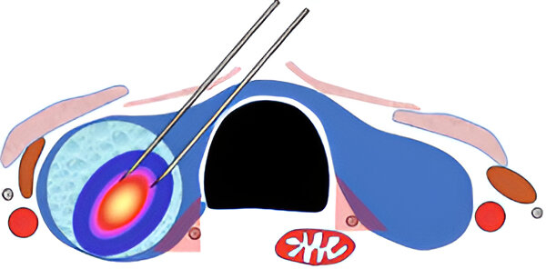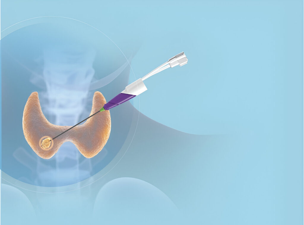 Microwave ablation is a technique for generating heat within structures to destroy cells via a probe placed through the skin. In the case of the thyroid, this means using that heat energy to burn symptomatic nodules to reduce their size.